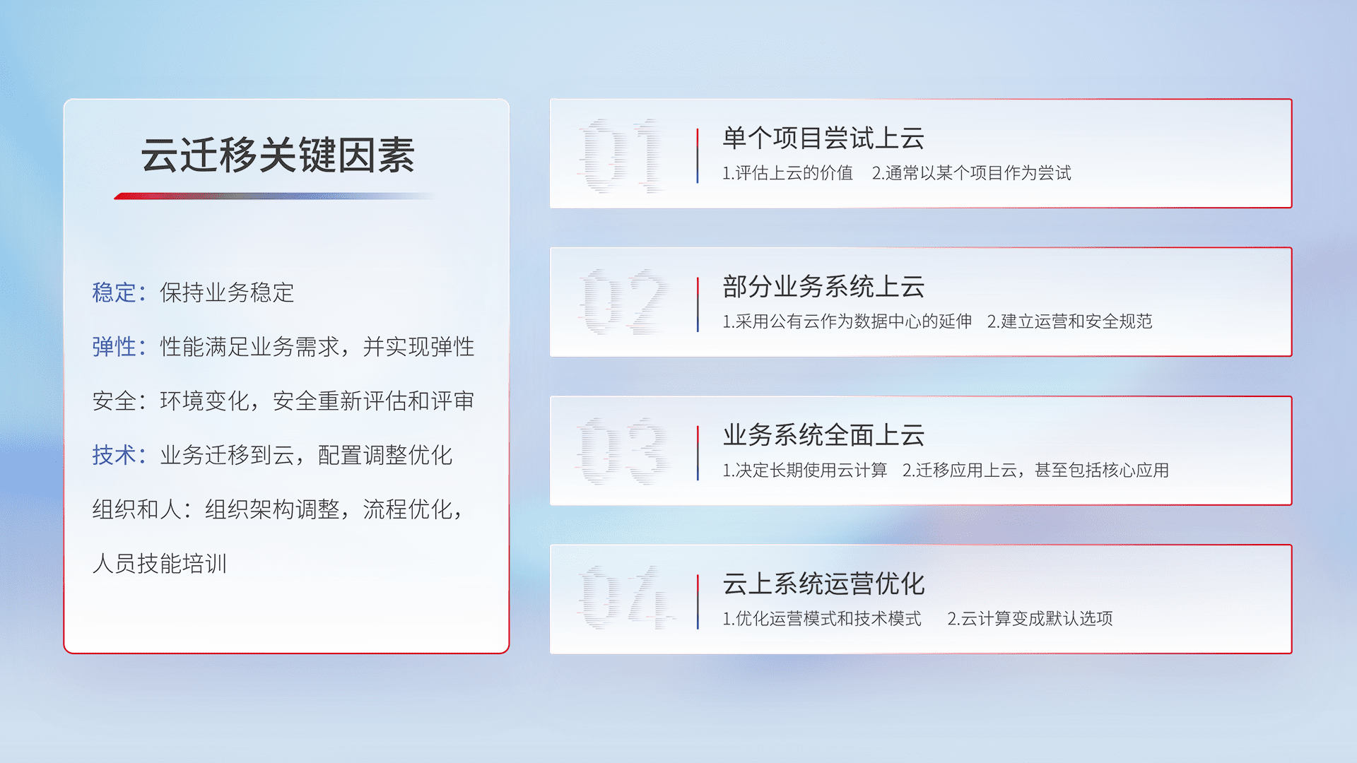 结合实际业务,,,从规划设计、、、、云平台选型、、、云原生改造、、、数据迁移、、、集成交付,,,迁移全过程为客户识别最佳上云路径,,做好风险识别管理,,,,设计网络架构、、、身份权限、、、安全审计合规、、、、操作审计、、、、日志审计、、监控告警策略、、、多站点容灾设计等,,,对云上基础设施进行整体规划,,,提升IT治理水平,,,以满足弹性、、高可用、、高性能的需求。。。