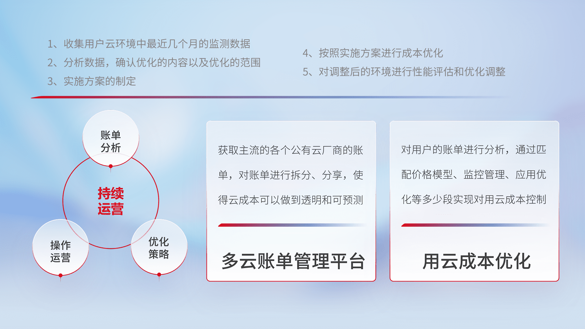 通过多云纳管,,,以统一的资源数据模型把客户的云资源进行抽象和封装,,,进而实现对多云资源的统一操作,,保障云资源管理的可靠性、、稳定性与可用性。。。量身定制化运维内容,,,配置、、开发运维、、、补丁管理、、、、备份、、、监控、、、、认证和访问管理、、审计和日常巡检等,,保障在用云过程中的可靠度,,稳定度以及高可用率。。。